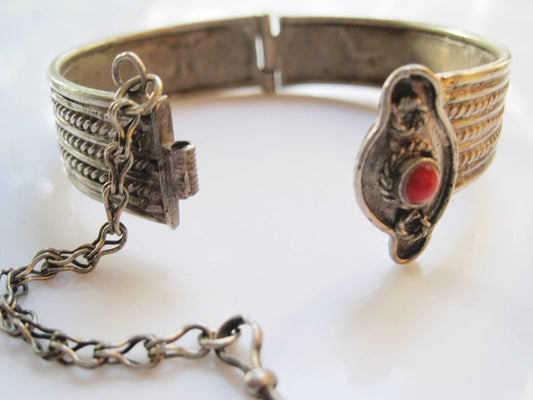 Antique Ottoman Hinged Bangle Bracelet with a Small Red Cabochon