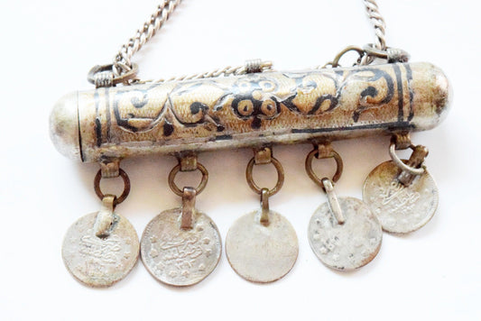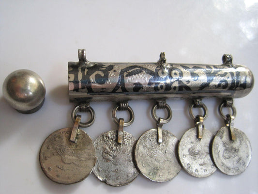Antique Ottoman Silver and Niello Amulet Holder with Silver Coins