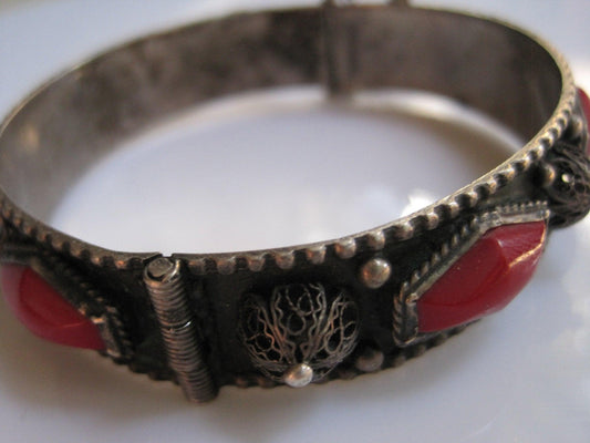 Vintage Silver Hinged North African Berber Bracelet with Red Stones