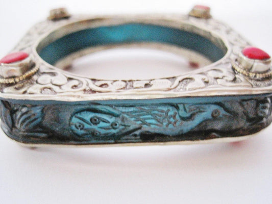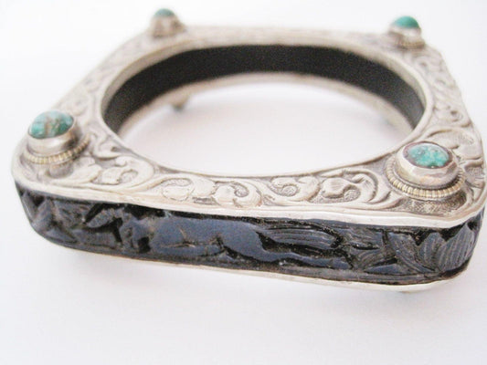 Vintage Square Carved Animal Purple Resin Bracelet from Nepal or Tibet with Silver Metal Overlay