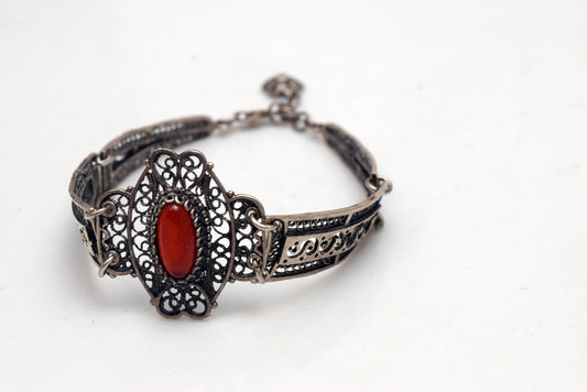 Vintage Sterling Silver Filigree Greek or Balkan Panel Bracelet with Brown Cabochon