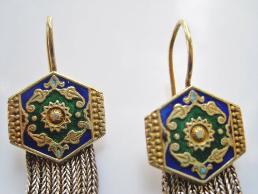 Vintage Turkish Enamel Earrings with Graduated Tassel of Foxtail Chains