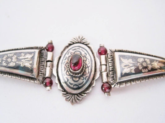 Vintage Turkish Russian Style Sterling Silver Niello and Garnet Bracelet