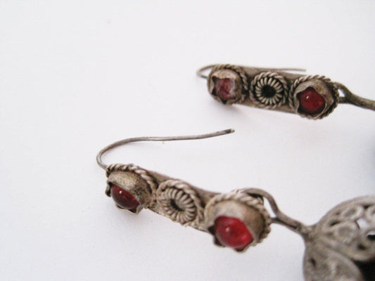 Antique Balkan Silver Earrings with Faceted Red Stone