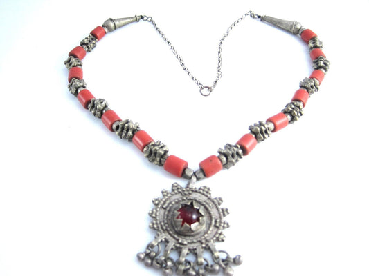 Vintage Yemeni Bedouin Necklace with Silver and Coral Colored Trade Beads