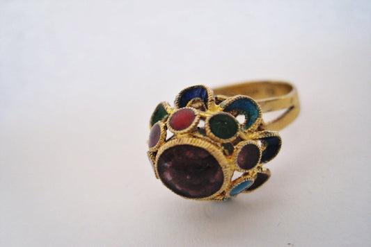 Vintage Silver Chinese Export Ring with Amethyst and Enamel