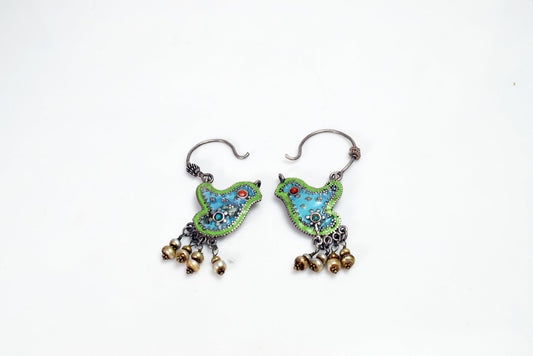Vintage Afghani Uzbek Style Silver and Enamel Bird Earrings with turquoise and coral