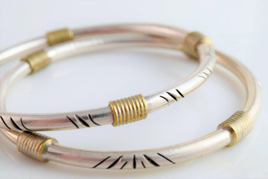 Vintage Pair of Two Tone Mexican Bangles Sterling Silver and Brass