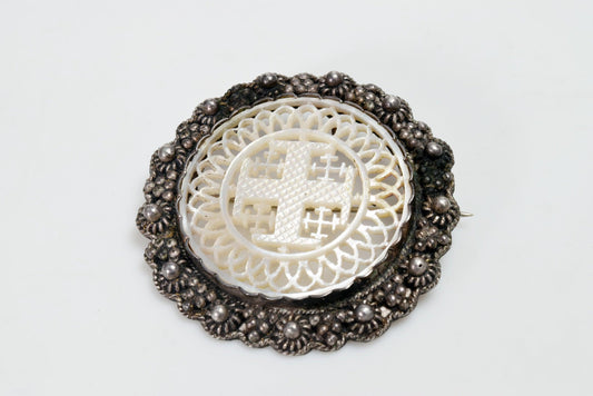 Vintage Silver and Carved Mother of Pearl Cross Brooch or Pendant From the Holy Land