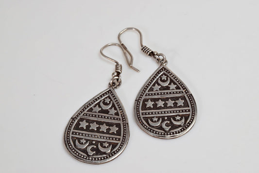 Vintage Silver Egyptian Stars and Moons Tear Drop Earrings