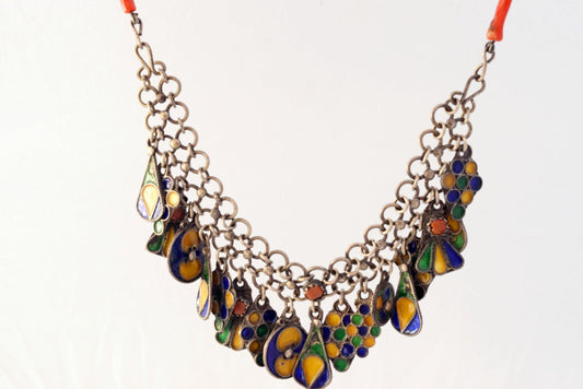 Vintage Kabyle Silver Enamel and Coral Choker Necklace from Algeria