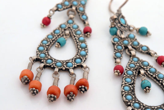 Vintage Afghani Uzbek Style Silver Turquoise and Coral Long Earrings