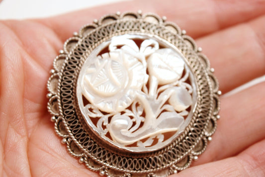 Vintage Silver and Carved Mother of Pearl Brooch or Pendant From the Holy Land