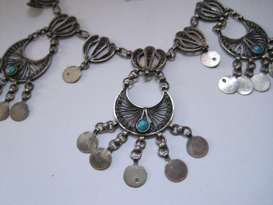 Vintage Silver and Turquoise Pretty Egyptian Choker Necklace with Coin Dangles