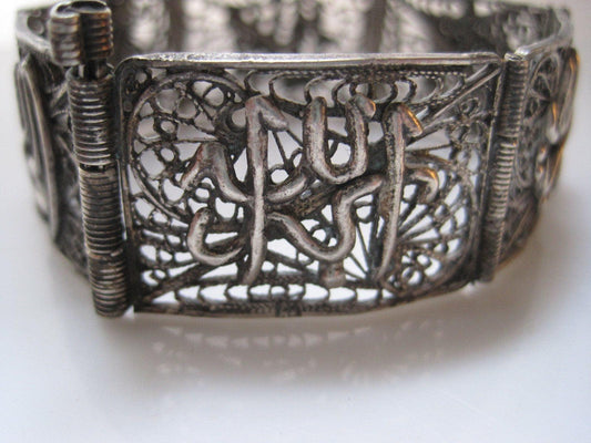Vintage Egyptian Silver Filigree Link Bracelet with Arabic Calligraphy