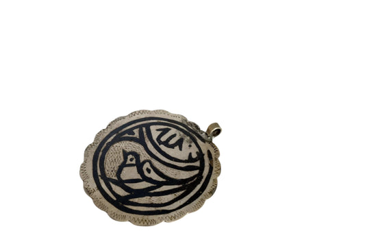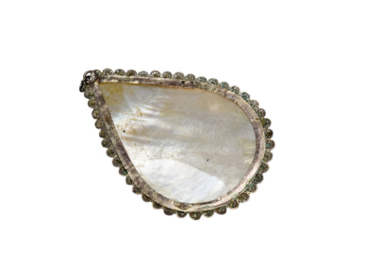 Vintage Middle East Hand Painted Mother of Pearl Pendant with Silver Filigree Border