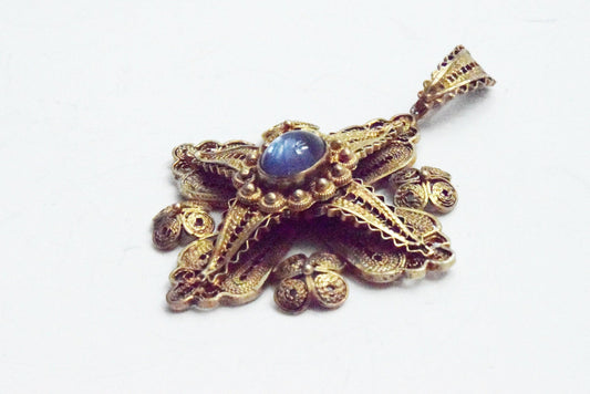 Vintage Gold Gilt Silver Filigree Jerusalem Cross Pendant with Blue Stone