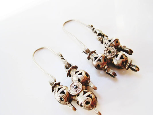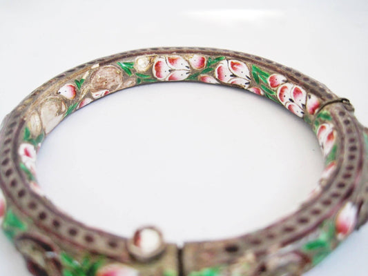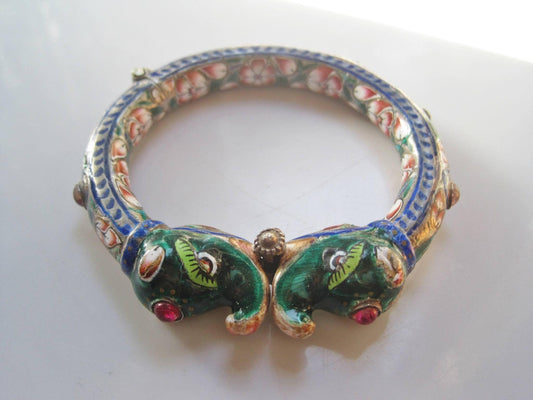 Antique Indian Silver and Enamel Double Elephant Head Bracelet from Benares