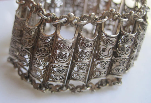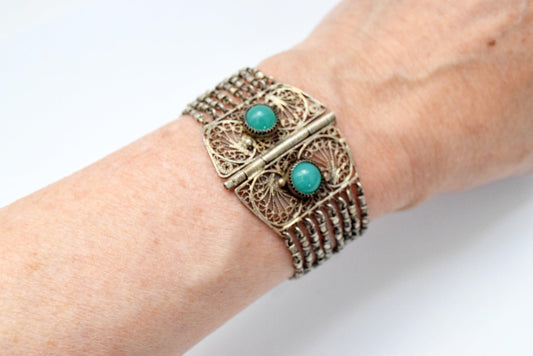 Art Deco Filigree Bracelet Made of Silver and Green Stone