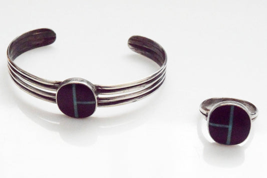 Vintage Native American Bracelet and Ring Set with Ironwood and Turquoise Inlay