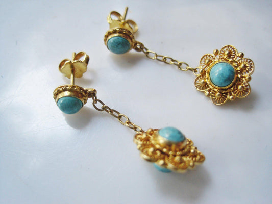 Vintage Chinese Gold Gilt Silver and Turquoise Post Earrings