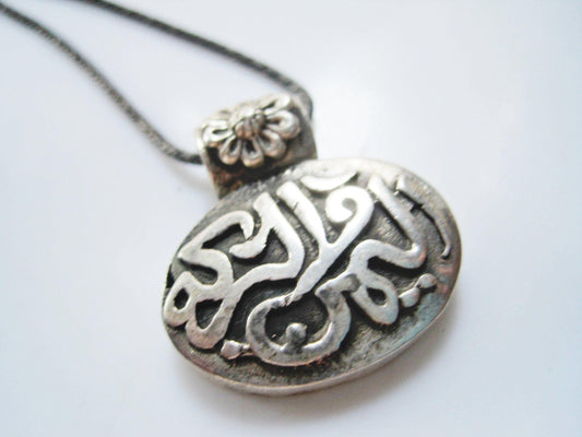 Vintage Egyptian Necklace, Arabic Calligraphy Sterling Silver Pendant Choker