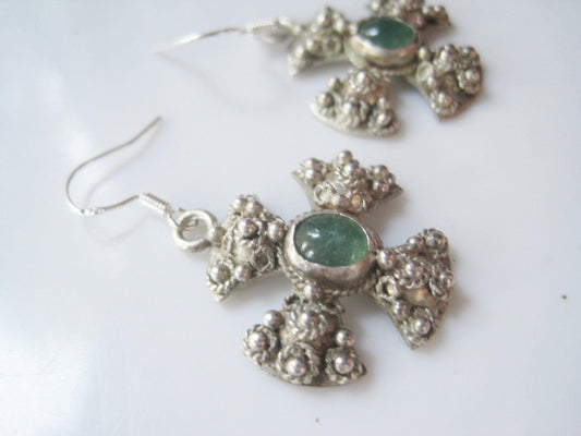 Vintage Jerusalem Cross Silver and Green Stone Earrings