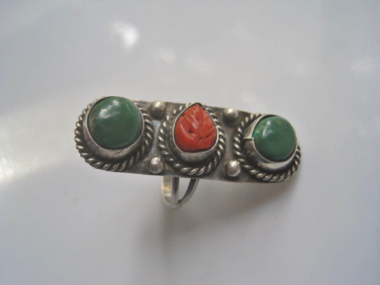 Vintage Asian Green Turquoise and Coral Long Size 8 1/2 Sterling Silver Ring