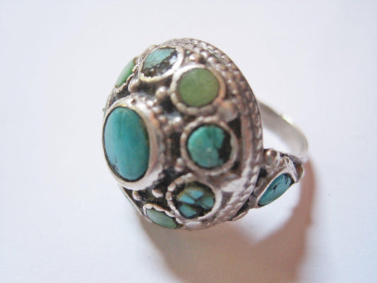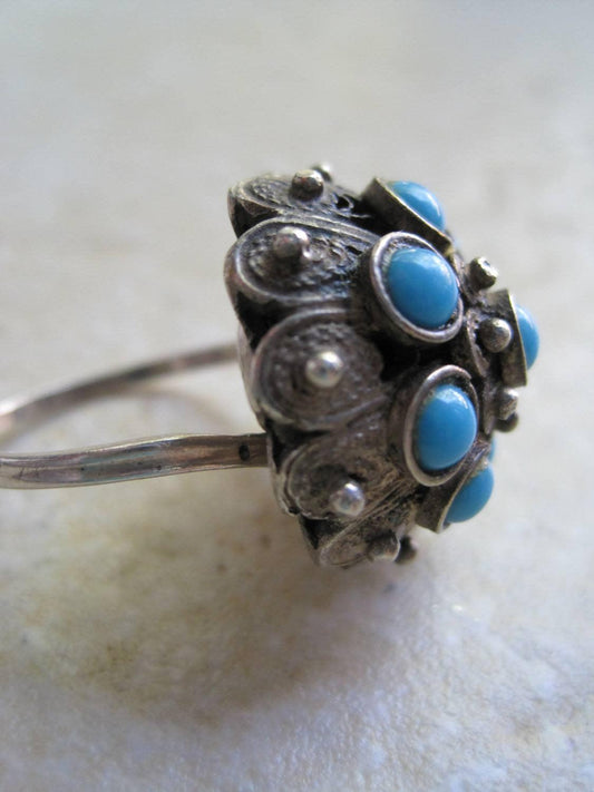 Vintage Etruscan Style Sterling Silver Filigree and Turquoise Cluster Ring