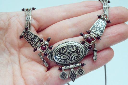 Vintage Turkish Silver Niello and Garnet Choker Necklace