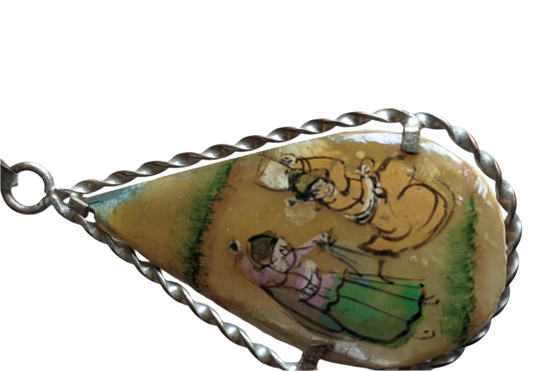 Vintage Mother of Pearl Hand Painted Pendant on a silver chain from the Middle East from the 1950s. This Teardrop shaped pendant has a twisted silver border and is painted on both sides. The miniature painting was drawn with a single brush hair under a magnifying glass and display what appear to be characters riding on one side and two women on the other. The pendant hangs from a nice silver link chain.