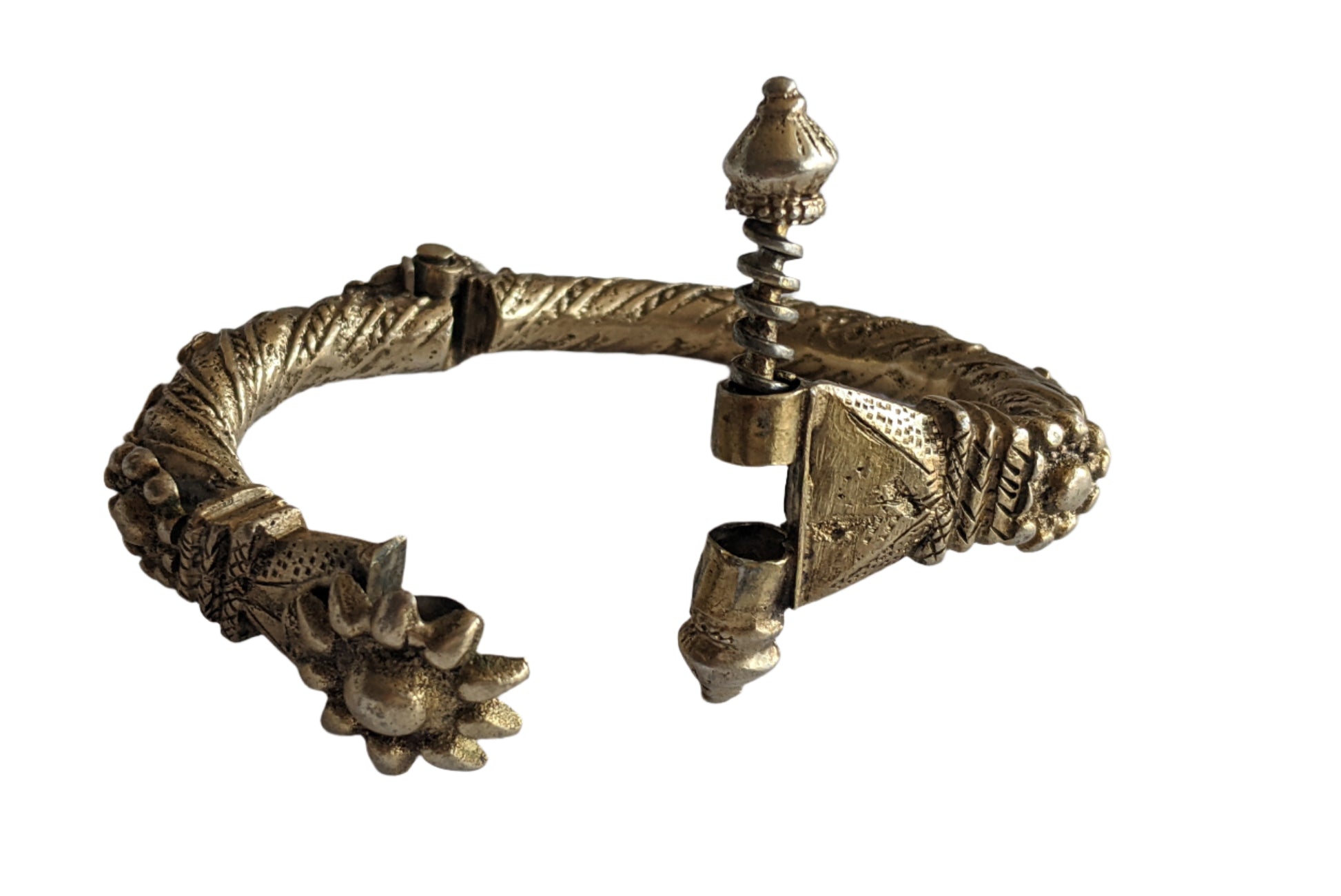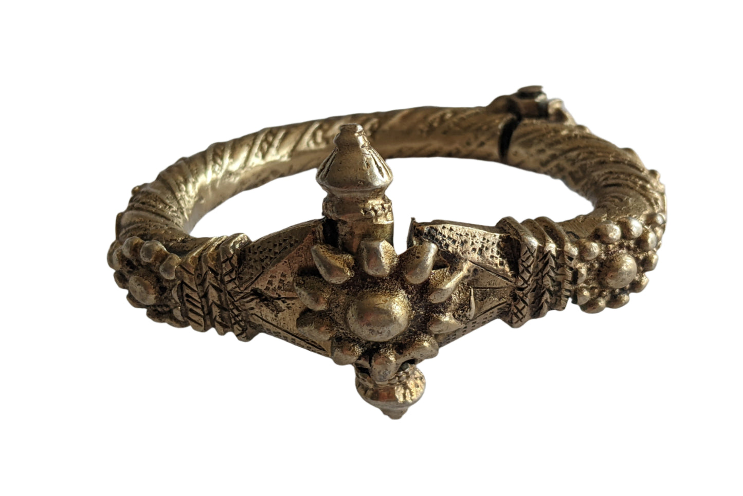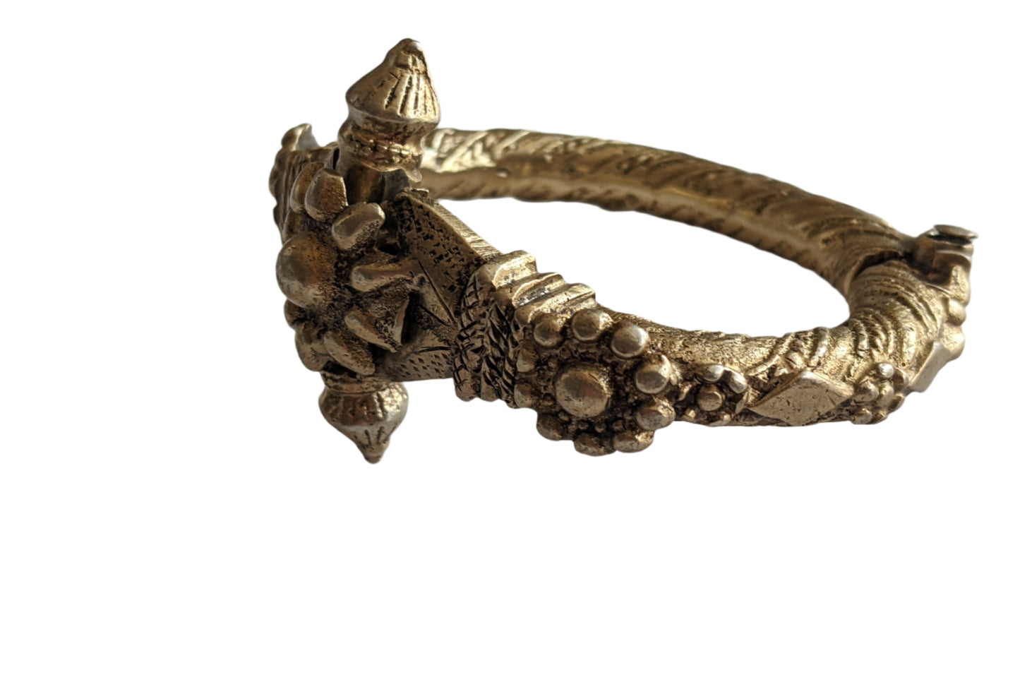 This delicate silver bracelet originates from South Asia, likely South India or Sri Lanka, featuring an intricate sunburst design on the front. Crafted from cast silver with a subtle gold gilt, it is tailored for a very petite wearer (dimensions provided below). The original hinge and screw pin function smoothly, and the piece remains in excellent vintage condition.