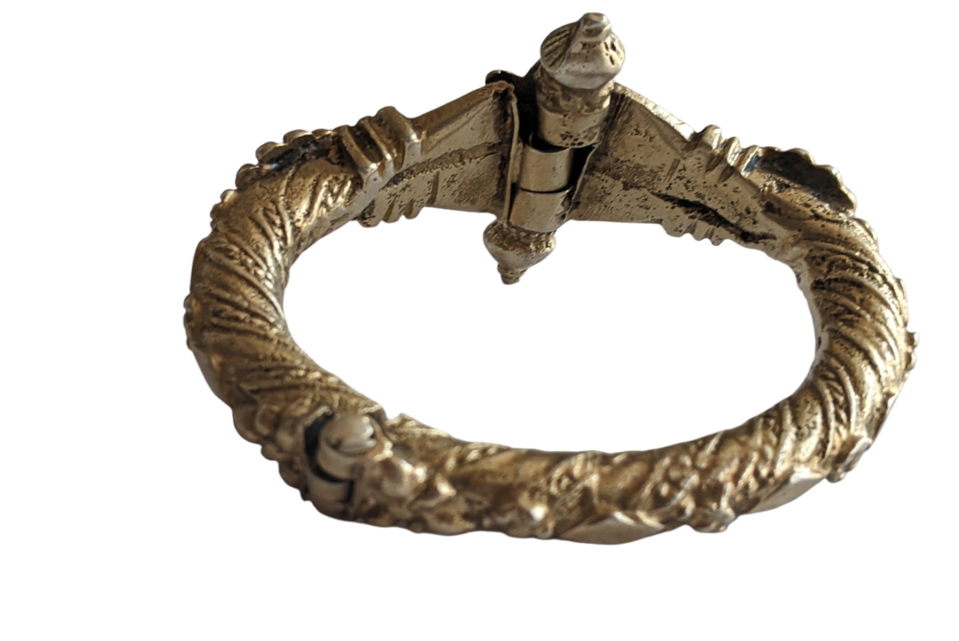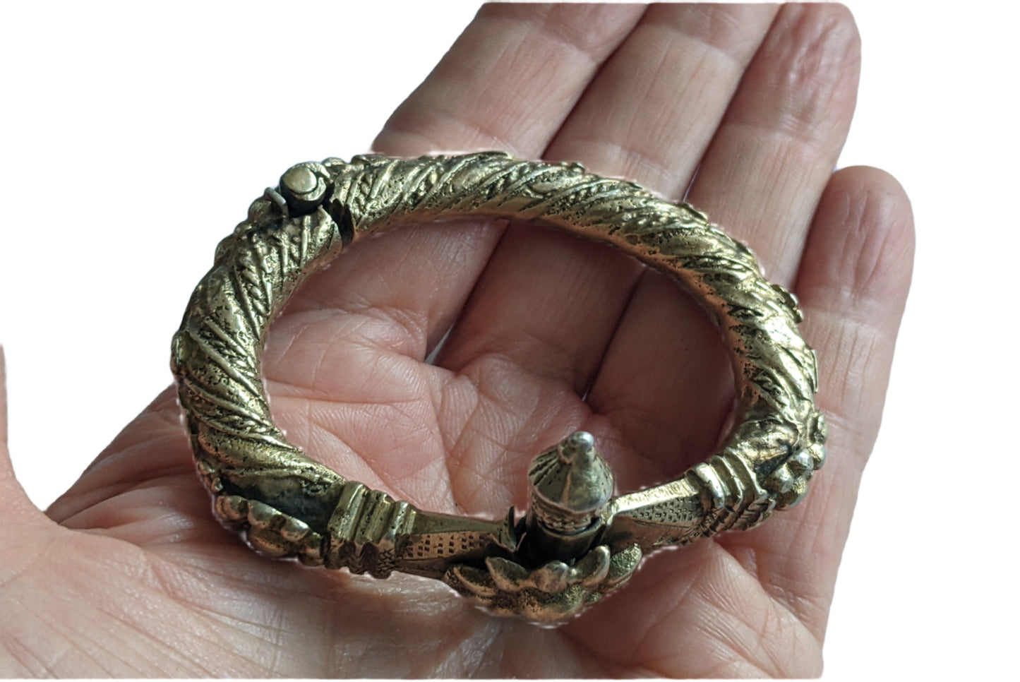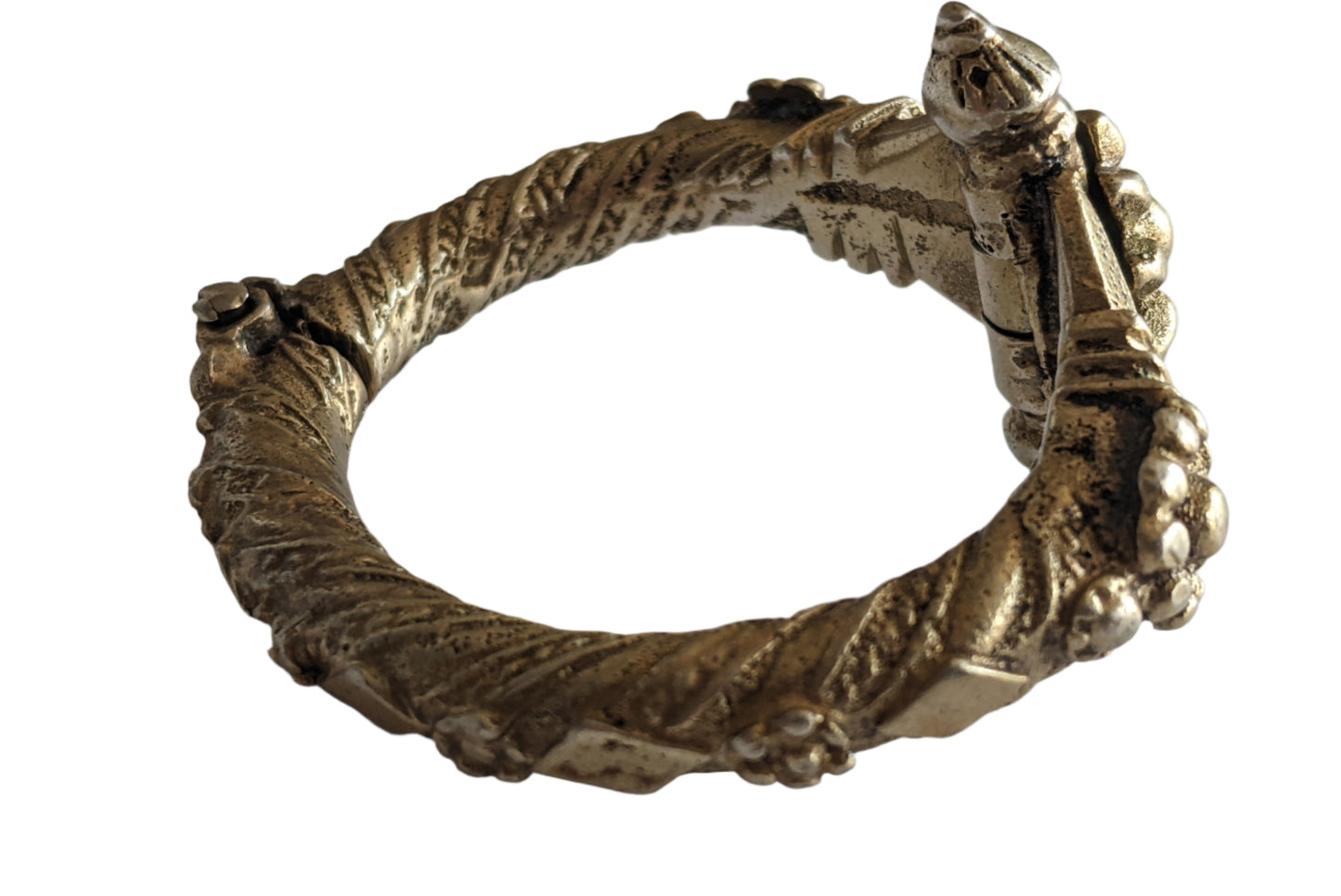 This delicate silver bracelet originates from South Asia, likely South India or Sri Lanka, featuring an intricate sunburst design on the front. Crafted from cast silver with a subtle gold gilt, it is tailored for a very petite wearer (dimensions provided below). The original hinge and screw pin function smoothly, and the piece remains in excellent vintage condition.